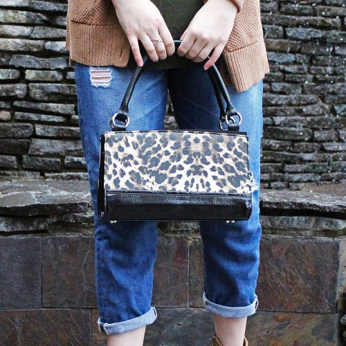 I was feelin’ a bit of an edgy vibe with my black dress and knotted sweater, so I decided to pair leather boots (with a gold heel, of course!) and a leather jacket together. Then to add a bit of color, I through in my favorite red structured bag.